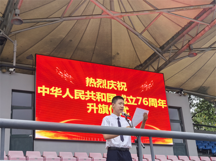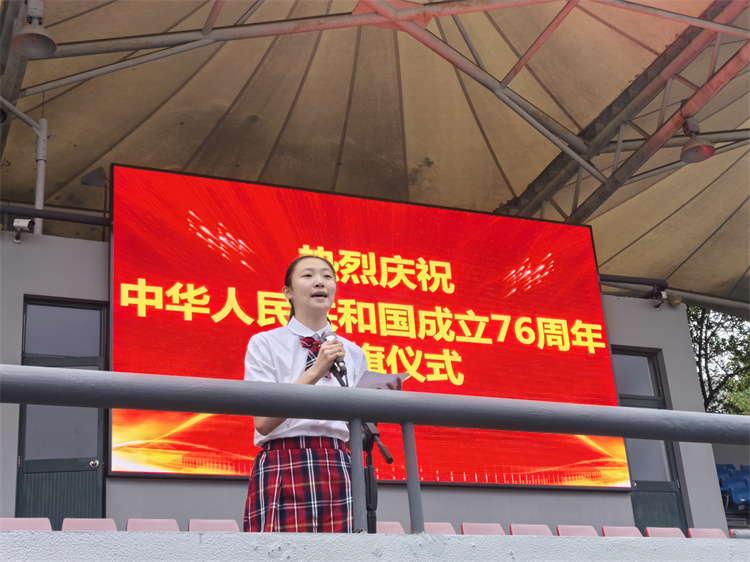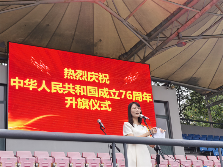 随后,校党总支副书记钱筱婷老师讲话。她回顾了新中国 76 年来的辉煌历程,结合文澜中学 “立德树人” 的教育理念,鼓励师生们在时代浪潮中坚守初心,将个人理想与国家发展紧密相连;同时向到场家长表示感谢,强调 “家校同心、师生同行” 是培育时代新人的重要力量,希望家校携手,共同为学生成长搭建平台,让爱国主义精神在代代传承中焕发新的光彩。