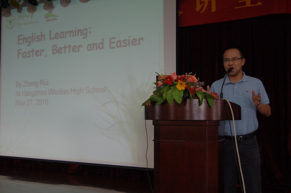 5月27日下午第三节课后,我校邀请了浙江大学外语学院的郑瑞博士为初二同学作了一堂《Faster,Better and Easier》的讲座,我校社团文化艺术节的人文大讲堂历来为同学们所青睐,在这里,同学们可以学到知识,增加见闻,感悟人生。