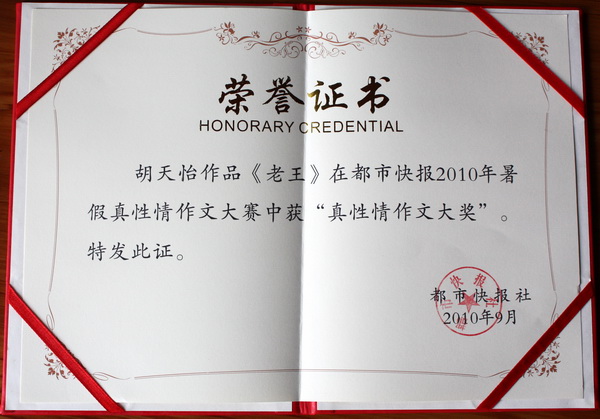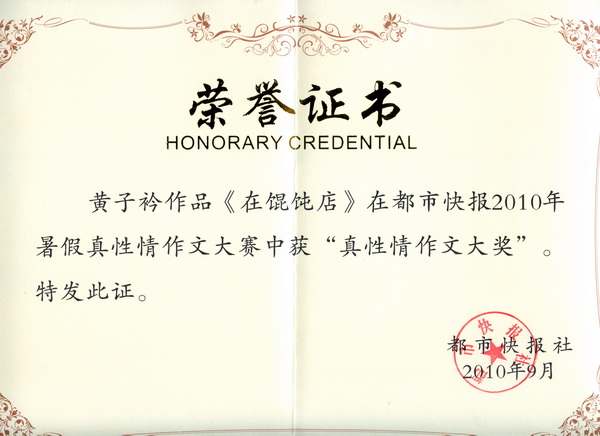 9月19日下午,在杭州都市快报组织的第一届“真性情作文”大赛颁奖现场,我校初三(5)班的胡天怡、初二(1)班的黄子衿同学荣获大奖。