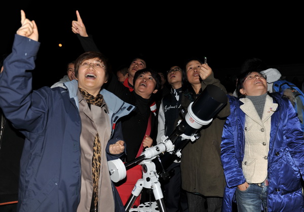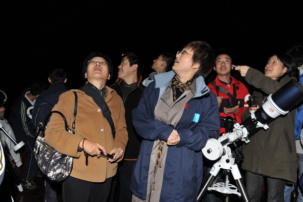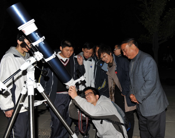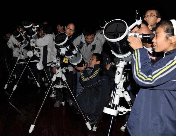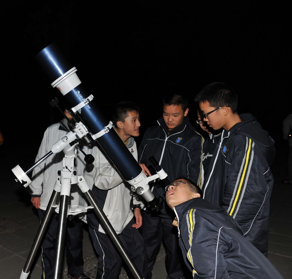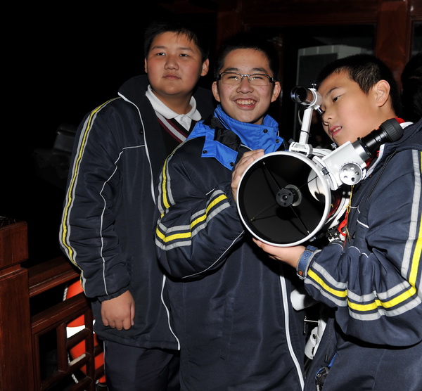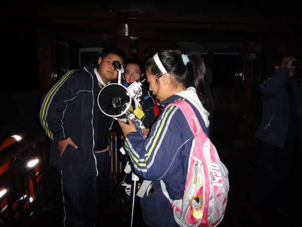 学生们个个技术娴熟地操作着天文望远镜,在科学老师们地指导下,如数家珍般的有计划地观测他们的目标星体。一声声地惊呼,一片片地欢笑,荡漾在下渚湖的湖面上。虽然寒意习习,但是显而易见,每个人都在体验着成功的喜悦。“我找到了!找到了”,学生们纷纷报告自己观测到的“木星”、“月亮”、“织女星”、“牛郎星”、“天鹅座”等等,那般童真和无拘无束地惊喜,感染了在场的每一个人。