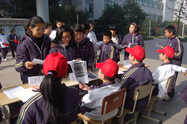 活动现场,很多头戴小红帽的普法工作人员手执一叠小报,认认真真地发给每一位路过的同学、老师。“没想到50多份小报不到几分钟就分发完毕,很受同学老师们欢迎。”“小红帽”兴奋地说道。一位正在阅读小报的同学这样概括其内容:“充实极了, “消费者权利”、“消费者和知情权的含义”、“保护未成年人合法权利”、“智力成果权”等板块,详细给我们讲解了在生活中可能遇到问题及相关法律链接。“同时,记者看到法律咨询处也里三圈外三圈围满了人,除了提问的,更多的同学则在专注地倾听。“我们从10月份就开始着手准备”,初二(8)班法律社社长郦心仪这样说道。活动结束后,记者采访了法律社的陈老师,他说:“咨询处的每一位同学都是做了大量的准备来参加普法工作的,尤其是对未成年人的相关法律条文,可谓有备而来,这次活动的目的就是要在全校范围内进行一次普法教育,使同学们能更真切地了解法律,知法、懂法、守法,做一个合格的公民。”