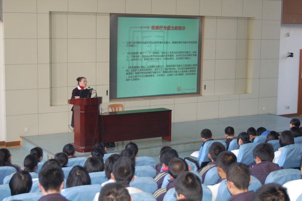 12月2日下午第四节课,文澜中学法制宣传周“法在身边”法律知识专题讲座在4号楼阶梯教室准时开坛。我校法学社邀请到了浙江儒毅律师事务所的蒋慧青律师主讲。初二同学参加了本次活动。讲座中,蒋律师通过“权利保护篇、核心法律篇、责任义务篇、案例分析篇四个部分来为同学们讲解,每个章节,都选取了与中学生休戚相关的法律条文进行剖析,让同学们明白自己应享有的权利和该尽的义务,蒋律师通过大量的真实案例向同学们阐释了法律的严肃性和不可触犯性,告诉同学们:法在身边,我们应改知法守法,做一个好学生,好公民。讲座在热烈的掌声中结束。本次讲座是我校继模拟法庭、法律咨询之后又一普法活动,无疑,本周的一系列法制宣传活动已在同学心中生根,很多同学纷纷表示希望加入到宣传法律的行列中,做一个“普法小红帽。”(通讯社记者 方生威)