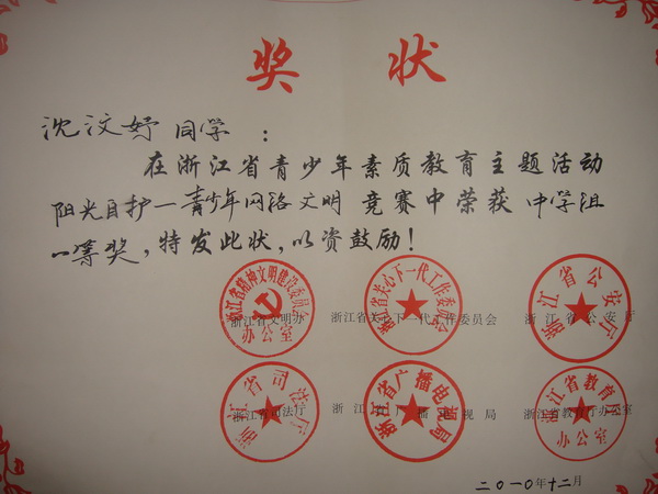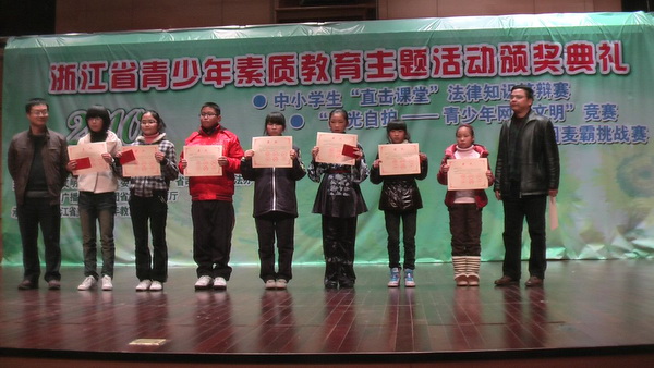 在浙江省青少年素质教育主题活动“阳光自护——青少年网络文明”竞赛中,我校初二6班沈汶妤、初二3班奚琦同学荣获中学组一等奖,初一3班陈雨奇、陈鹏同学荣获三等奖,沈汶妤同学还作为代表参加了颁奖仪式,在此对获奖的同学表示祝贺。