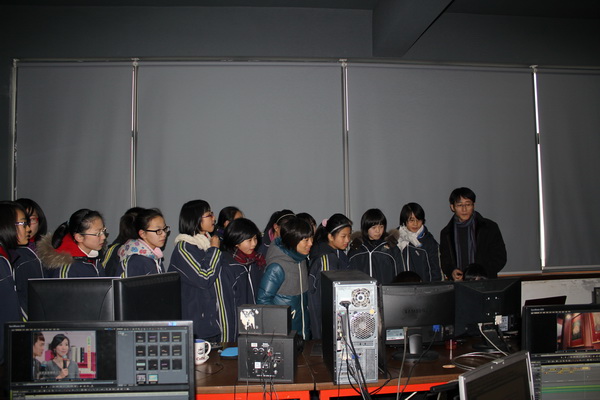 日前,我校“花儿剧社”参观艺能传媒公司,与杭州电视台的“青春门5号”亲密接触。1月11日下午,“花儿剧社”成员在负责人吴雪杭老师的带领下,来到了艺能传媒公司。一下车,我们就有幸目睹了“青春门5号”贺岁档之一的部分外景拍摄过程。剧中人物“刘师母”出戏后与“花儿剧社”合了影。接着,我们在“花儿剧社”辅导员朱伟导演的带领下,参观了剪辑部,并共同审片。之后,我们来到了“青春门5号”的内景拍摄现场。这里导演、摄影师、演员们正在紧张地拍摄着。我们的到来,两位演员“不为所动”,依旧全身心投入表演,使“花儿剧社”同学们赞叹不已。到了下一个场景,只见导演与演员门热烈地讨论着,连桌上摆放的物品、演员们进门的脚步都反复斟酌,力求完美。一个四十秒的镜头,竟反反复复重拍了七次,才算通过。休息期间,“花儿剧社”的同学们向专业演员和导演讨教学习,并合影留念。另外,我们还参观了“高枕无忧”“全民大拼购”等节目的录制现场。
