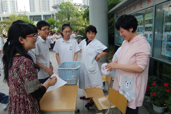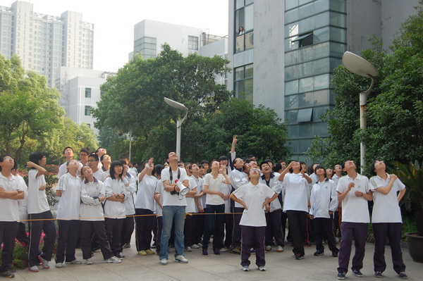 “喔”——,又一只鸡蛋稳稳落地,人头攒动,兴奋不已,这是本届社团艺术节初二年级组的特色节目“鸡蛋撞地球”比赛现场。5月27日下午第三节课后,初二年级同学拿着自己的杰作聚集在比赛地兴奋地做着各项准备。