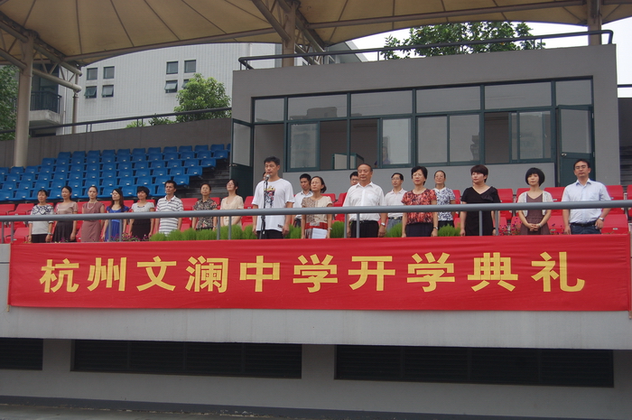 在庄严的升旗仪式后,首先由学生处副主任王薇老师向全校师生和嘉宾介绍我校四位校级领导:任继长校长、徐青青书记、薛莹副校长和董立毅副校长。接着,她介绍各处室的中层领导、年级组长和各学科教研组长。浙江天堂硅谷创业投资有限公司总裁办的张朝洪经理以及浙江日报社、浙江电视台的领导和主任记者也一起参加了我校的开学典礼。