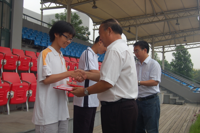 任继长校长、张朝洪经理为今年中考状元徐恩迪、探花徐之恒同学颁奖