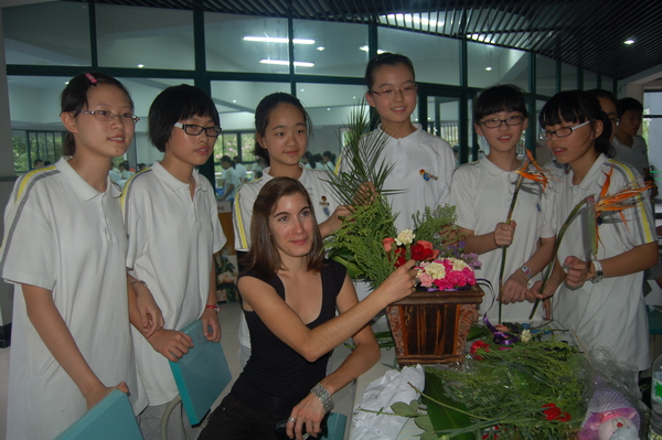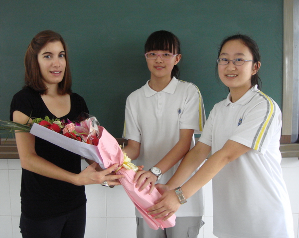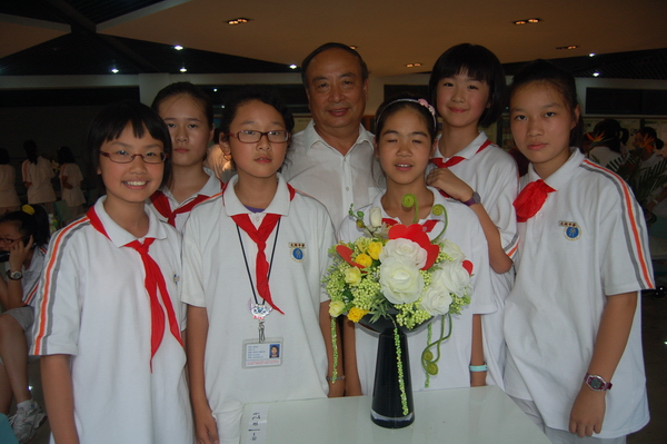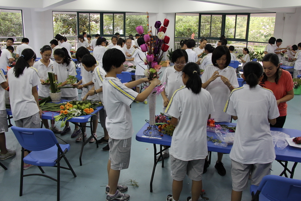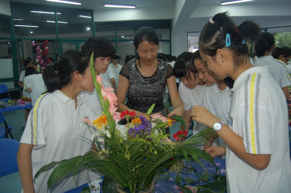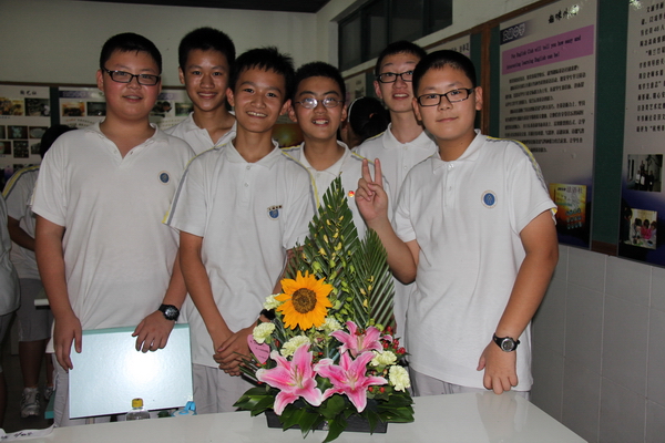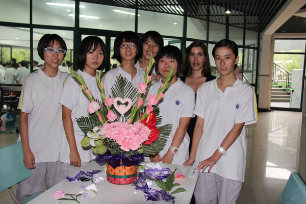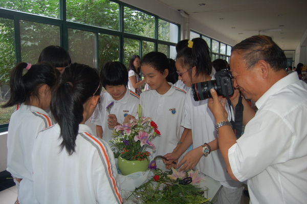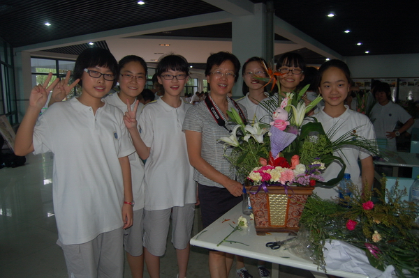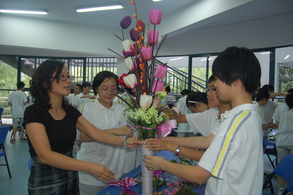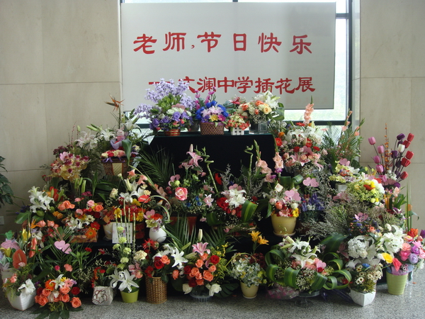 9月7日下午,休闲厅里充满了同学们兴奋的议论声。丝带花、纸花、鲜花,衬着一张张如花的笑脸,浅紫、嫩绿、粉红,一个个小小身影在鲜艳的色彩中忙碌着。老师们一手拿着同学们赠送的鲜花,一手拿着评分表,脸上露出了幸福的笑容。