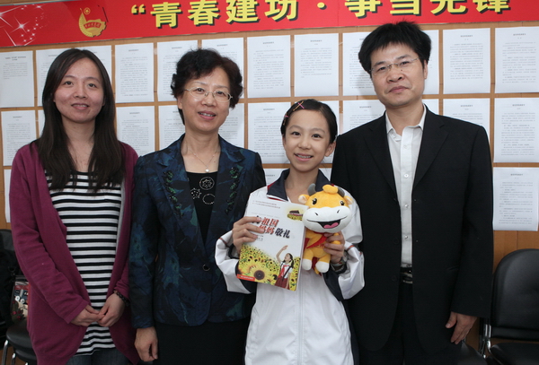 9月30日下午3:00,在团省委5楼大会议室,青年时报社为我校初一(5)班吴宛谕同学的新书《向祖国妈妈敬礼》举行首发式。吴宛谕同学表达了她对多年来一直关心和帮助她的长辈和老师的感谢。我校党总支书记徐青青老师,吴宛谕同学的班主任劳佳瑜老师出席了会议,并接受了记者的采访。