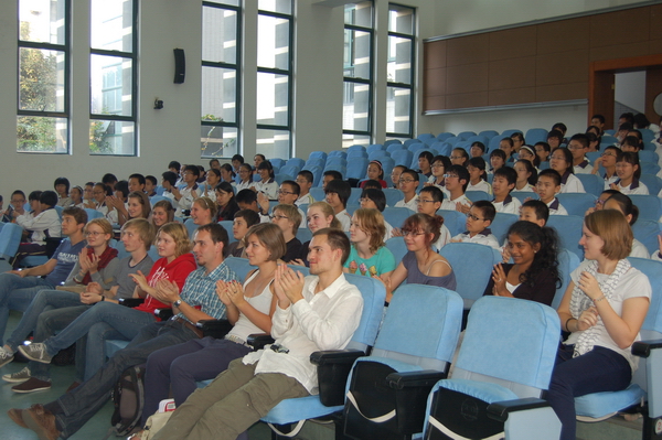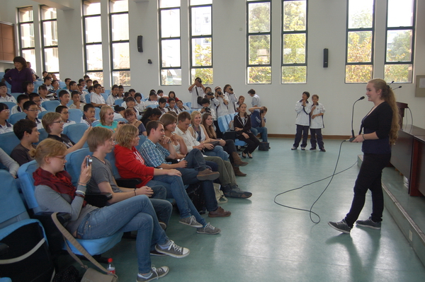 18日下午德国师生与我校“旅游英语”、“口语演讲”、“口语模仿秀"、“趣味英语”、“交际英语”、“英语话剧社”等等社团师生聚集一堂,德国维特副校长介绍了他们学校和教育教学情况,德国学生也发言介绍了他们的学习生活。