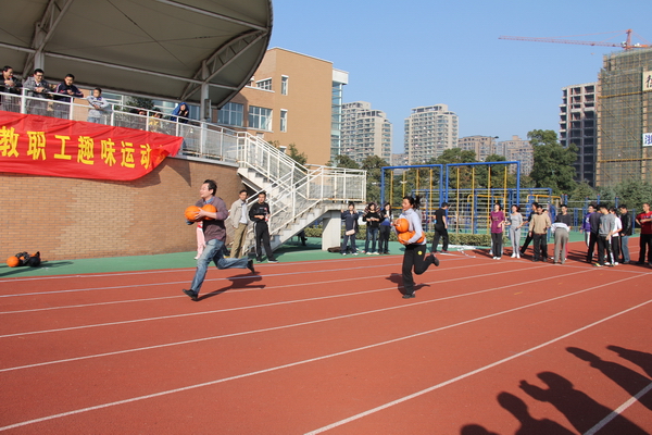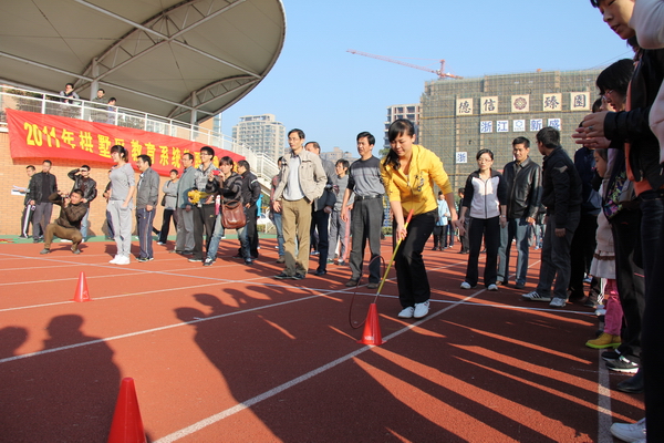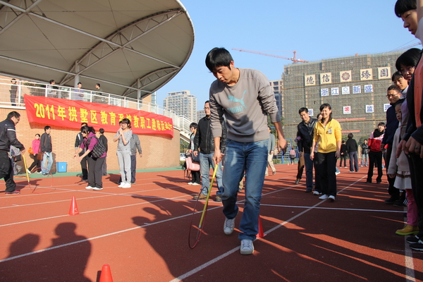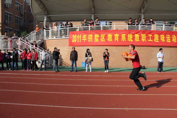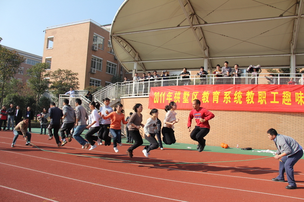 11月27日上午,拱墅区教职工趣味运动会在大关中学文澜校区火热举行。我校由徐青青书记、工会主席杨清秀老师带队十余名教师参赛,现场气氛异常火爆激烈。“趣味运动会”比赛项目样式新颖,内容各异,风格迥然,突出了“趣味”与“合作”的主题精神。此次趣味运动会包括“动感铁环”、“十人十一足”、“ 齐跳大绳”、“抱球接力”五个趣味项目,既考验团队合作精神,也充分展示了个人风采;既需要精湛的技巧,也要求消耗体力的剧烈运动。我校教师在齐心协力机智灵活的合作下取得了中学组团体第一名的傲人成绩,本次运动会精彩场面随处可见,各个项目或激烈火爆,或扣人心弦,或趣味盎然,不仅锻炼了教职工的竞技意识,增强了交流与沟通,而且展示了教职工开拓进取、团结奋进的精神面貌。此次趣味运动会缓解了我校教职工的工作压力,进一步推动我校健身运动的深入开展,为构建和谐校园,健康文澜提供契机。最后在一串串欢笑声中,本次趣味运动会落下帷幕圆满结束。