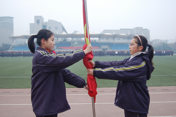 12月19日的晨会上,我校举行了新老国旗班交接仪式。在庄严的国歌声中,新老国旗班成员在红色的塑胶跑道上,精神抖擞、一丝不苟地完成了交接仪式。初三国旗班的同学在过去一年里出色地完成了日常升降国旗的任务,捍卫了国旗的尊严。新一届国旗班由初二年级中的优秀同学组成,经过前期的严格训练,他们意气风发、斗志昂扬。