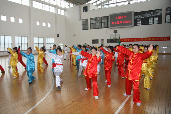 伴随着运动员进行曲,全体教职工以工会小组为单位入场,小组长们拿着引导牌,按比赛抽签顺序站在场地中央。接着,徐青青书记致简短的开幕词。她勉励大家积极锻炼自己的健康体魄,形成“我运动,我健康、我快乐”的良好局面。希望各参赛队发扬“友谊第一,比赛第二”的拼搏精神,充分发挥各参赛队的竞技水平,紧密配合,团结协作,争取赛出风格,赛出水平,把运动精神带入到今后工作学习中。随后,音体美组为大家表演精彩的太极拳,接着是英语和行政组,语文和数学组,科学和社政计算机组参加比赛。各位老师都使出了浑身解数,尽全力参加好比赛。同样,在后面三项比赛——滚铁环绕障碍迎面接力、抱球迎面接力和十人齐跳大绳中,老师们也都积极参加,都取得了较为满意的成绩。