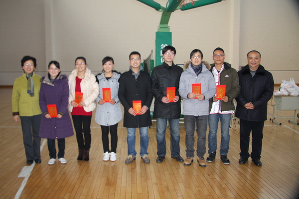 任校长为获奖的教研组颁奖,各工会小组长上台领奖。任校长在闭幕时做了简短的讲话,他肯定了今天老师们参赛的热情,鼓励老师们以后积极参加体育锻炼,增强自己体质,为自己的工作奠定一个身体底子,最后预祝全体老师在2012新年里身体健康、工作顺利。