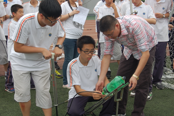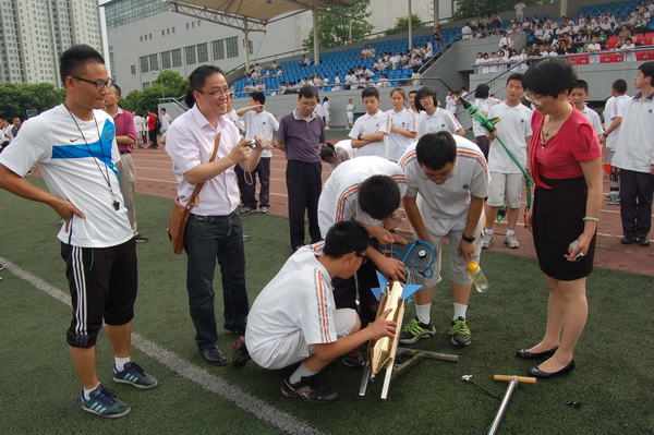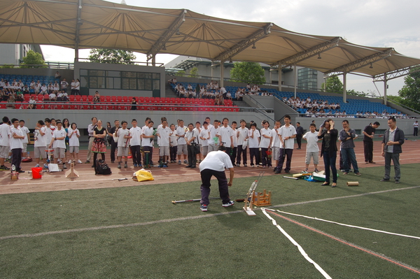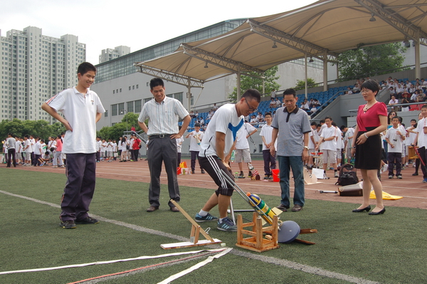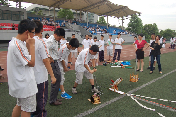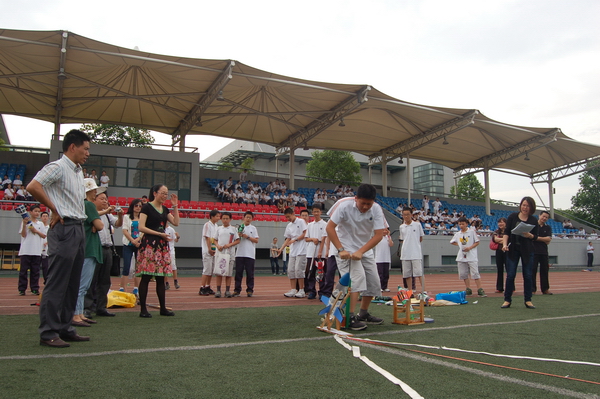水火箭,即以可乐瓶为主体设计制作的火箭模型,模型内灌有水,通过增大瓶内气压,使火箭冲离发射架,利用反冲力飞出一段距离。本次大赛规定,每名选手有两次发射机会,若火箭落地点超出发射点两侧共45°角范围或距发射点不足10米,则制作失败。10个班级分成三组,在操场上的三个赛点同时进行比赛,参赛同学在跑道上候场,不参赛的同学则在看台上为他们呐喊助威。整场比赛持续约一小时四十分钟,其间不断有水火箭突破之前记录,飞出极远距离,博得一片喝彩。