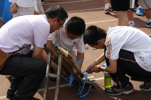 3、4、5、6班所在的第二赛点,水火箭屡创辉煌,飞行距离记录从足球场中场处一直刷新至对面跑道最远端。初上场的三班,以整体水平高取得优势,而四班则是爆出了本场比赛的个人冠军。此同学的水火箭在同学、老师轮番上阵打气三四分钟后,一鸣惊人地飞速射出发射架,在云中腾飞出一道弯弧,掠过宽阔的操场、高耸的看台,甚至校园马路,飞进对面的小区,虽其具体飞行距离难以测量,但足以是本场冠军。