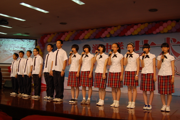 走进主会场,就能感到空气中洋溢着同学们喜悦激动的心情。舞台上,一排排架子鼓、电子琴整齐地摆放着,原来是文澜中学的电声乐队。演奏者们一个个技艺娴熟,专心投入,简直能与专业乐手媲美了。两名歌手也是唱功不俗,一首情意真挚的《同一首歌》打动了全场观众。这支电声乐队刚组建不久,没想到这么短时间便能为我们献上如此美妙的音乐,着实令人惊叹、佩服!
