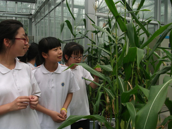 在“木槿”姐姐的带领下,我们漫步林荫小径,辨认各种植物。火红的鸡爪槭,似秋日的红枫“红于二月花”;各色的夹竹桃,白的似雪,粉的似霞;尚青的山楂、红透的梨子,高挂在树枝上。“木槿”姐姐就像植物百科全书一样,这里所有的植物她都认识,我们问的问题她都能解答。比如,有的植物叶片上的突起其实是虫瘿,是蚜虫等吸取植物汁液,引起植物分泌激素而形成的;树杆上的蝉蜕是蝉的幼虫变成成虫时蜕下的壳,是一种常见的中药。我们无意中发现了一对天牛,这令同学们兴奋莫名,小心翼翼地将它们抓下来放入瓶中,打算带回去仔细观察一番再将它们放生。我们还参观了现代化的玻璃暖房,见到了生物系的哥哥姐姐所精心培育的转基因水稻、玉米和毛豆等,其中毛豆和我们平时看到的很不一样,居然是缠绕茎的,这令我们不禁感叹科学的博大精深。