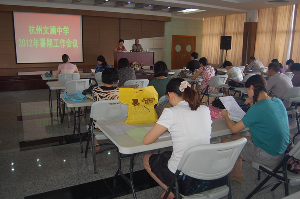 8月16日,杭州文澜中学2012年暑期工作会议在学校多功能厅隆重召开。参加会议的有任继长校长、徐青青书记、薛莹、董立毅副校长、中层干部、年级组长、教研组长和班主任,以及初一初三的全体教师,共七十余人。
