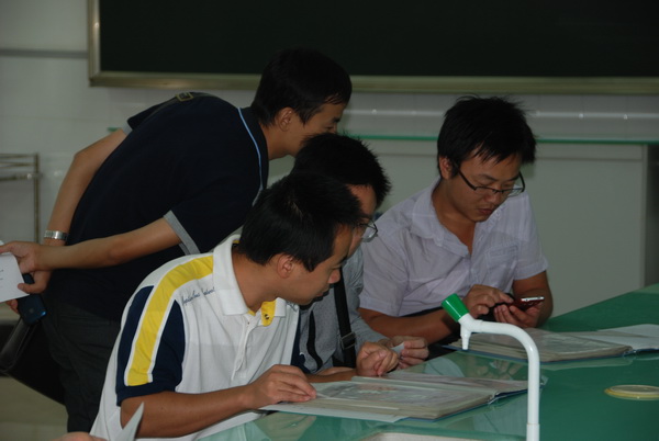 吴兴实验中学老师察看实验记载卡并拍照记录