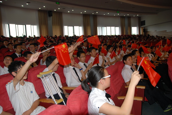 初二4班的《八路军拉大栓》表演情动于中而发之于外,气势充沛,声若洪钟,壮怀激烈。5班的《我和我的祖国》柔和自然,舒缓优美。7班的《明天会更好》更是将同学们的爱国之情报国之志得以充分表达。1班最后出场,一曲《北京欢迎你》,唱的干脆利落,唱的豪情万丈,唱出中国人的自信、宽容和大气,唱出青年学生的风华正茂、挥斥方遒。接近尾声时,在主唱张云天的号召下全年级同学挥舞手中的小国旗和荧光棒一同齐唱并爆发出雷鸣般的掌声。但比赛尚未结束,在任校长的带领下,全场起立齐唱《歌唱祖国》。“五星红旗迎风飘扬,胜利的歌声多么响亮……”,在歌声的海洋里,师生们抒发着对祖国浓浓的爱意,对祖国深深的祝福,再次将比赛推向了高潮。