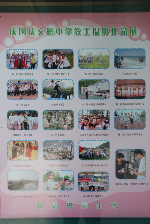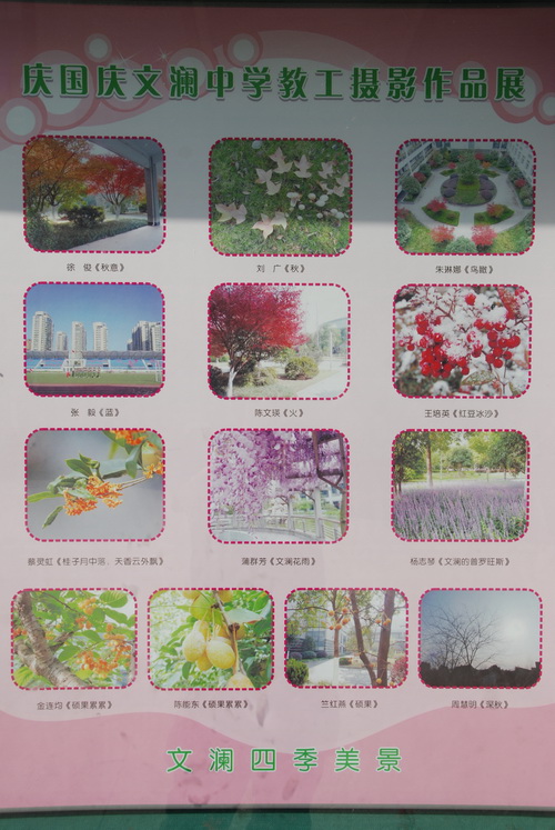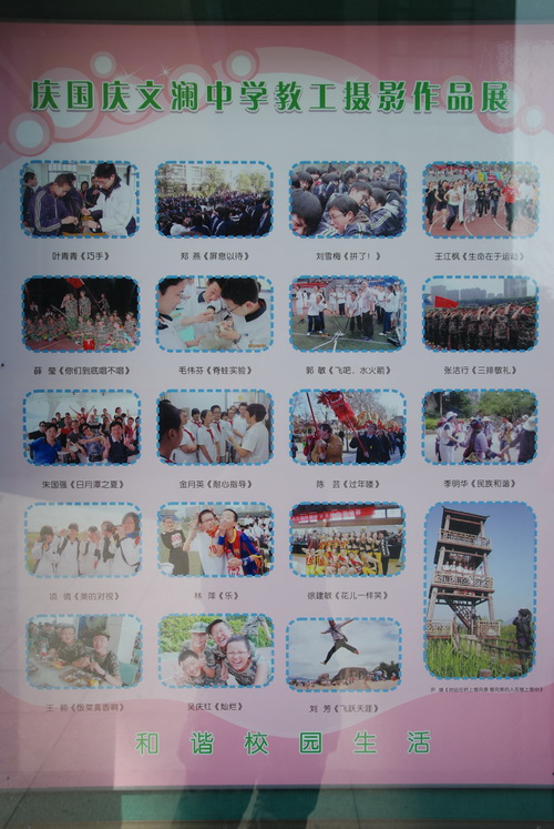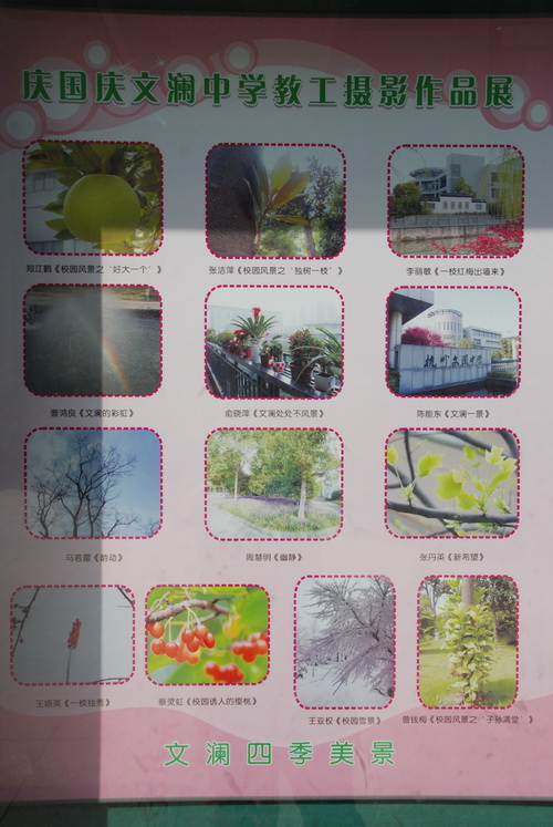 为庆祝中华人民共和国成立六十三周年,全面展示我校教职员工的精神面貌和艺术素养,我校党支部、工会举办了“庆国庆”教工摄影作品展,用摄影这一特殊的艺术形式和视角,歌颂党,歌颂祖国,围绕“爱生、乐业、成长”主题,展示文澜和谐校园美景。