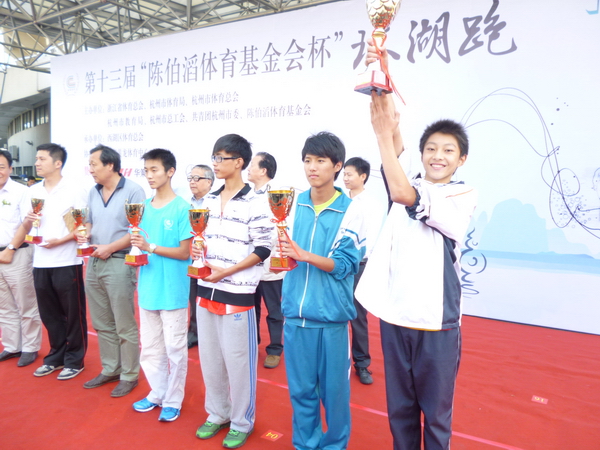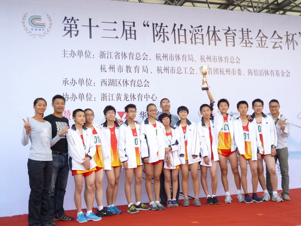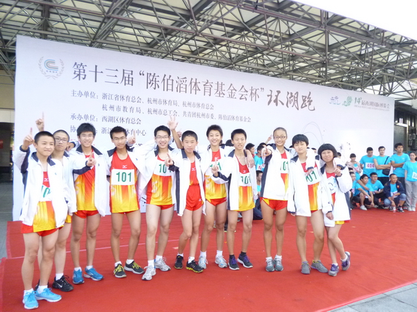 由省体育总会、市体育局、市教育局、市总工会、市团委、陈伯滔体育发展基金会联合主办的浙江省暨杭州市第十三届“陈伯滔体育发展基金会杯”环湖跑比赛于2012年9月29日上午在浙江黄龙体育中心举行。在全程8000米的初中混合接力组比赛中,我校10位运动员不畏强手、奋力拼搏,与其他学校展开了激烈竞争。每一位选手凭借顽强的毅力都以最快速度跑完了全程,最终我校接力队以23分40秒的成绩获得了第一名的佳绩。
