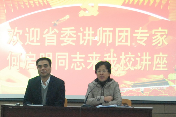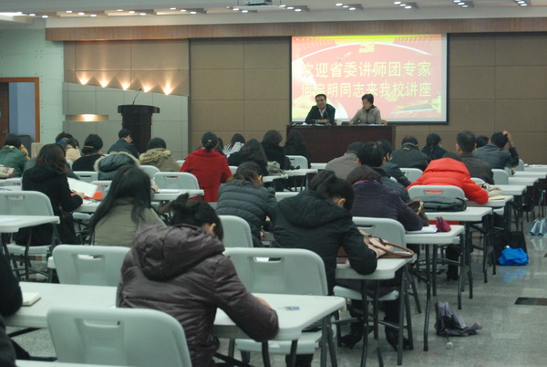 为了深入学习党的十八大精神,11月23日下午,我校在多功能报告厅举行“学习党的十八大精神”的专题讲座。浙江省委宣传部教育处何启明处长应邀作了题为《解读十八大》的专题讲座。此次讲座由学校党委书记徐青青主持,全体教职工参加。