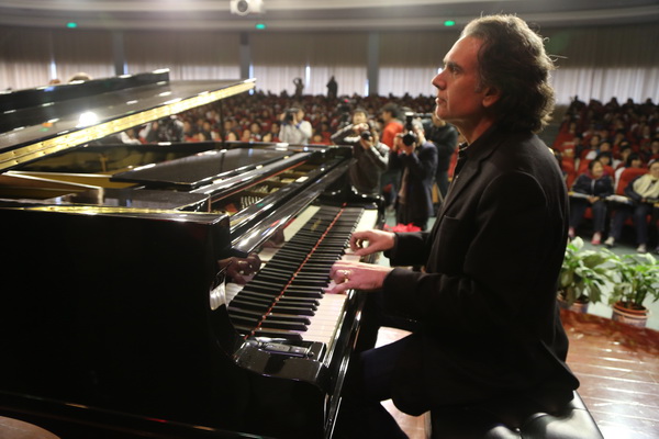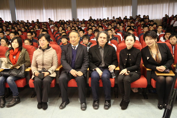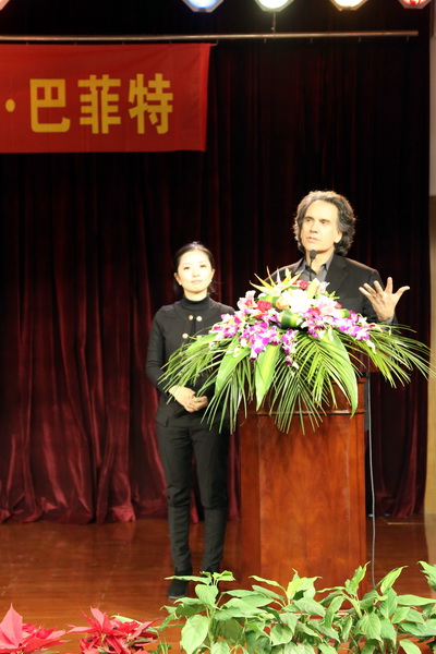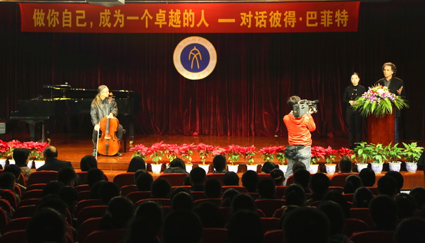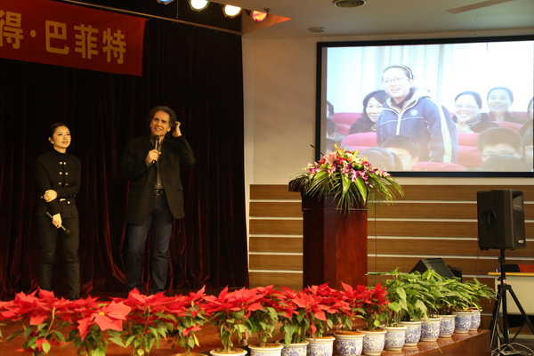 在学校演讲厅,巴菲特先生以“做你自己,成为一个卓越的你”为题,做了精彩的演讲。巴菲特先生首先坦承,自己虽然是股神沃伦•巴菲特的儿子,但并非时下中国讲的“富二代”。他说自己在很平凡的美国小镇奥马哈长大,没有追随父亲去华尔街工作,最终选择自己钟爱的音乐之路。他感恩富有爱心的父母的支持,甚至在斯坦福大学只读了三个学期休学去追求音乐梦时,父母依然竭力支持理解他,希望儿子能找到自己喜欢做的事。他说自己在人生路上曾遭遇最大的艰难,但“我的音乐道路没用到父亲一分钱。”他说一生获益最大的哲学就是“做你自己”。演讲中,巴菲特先生的语言时而幽默风趣,时而温和平静,时而简洁有力。六百多人的报告厅座无虚席。