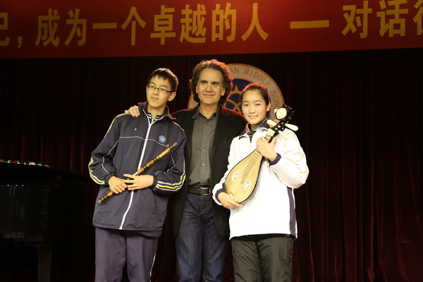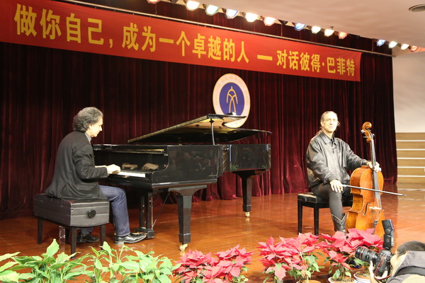 之后,巴菲特先生及其好友表演钢琴、大提琴合奏。他的手一触及琴弦,如水般倾泻而出的音乐旋律顿时充溢了整个报告厅,听众深深陶醉在美好乐曲的情境中。我校民乐团郑轶凡和黄凯寅同学也分别为巴菲特先生一行表演柳琴和笛子独奏,赢得先生的好评。