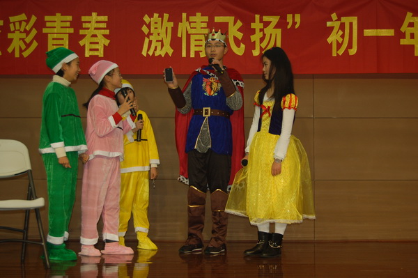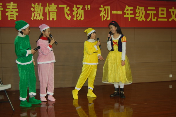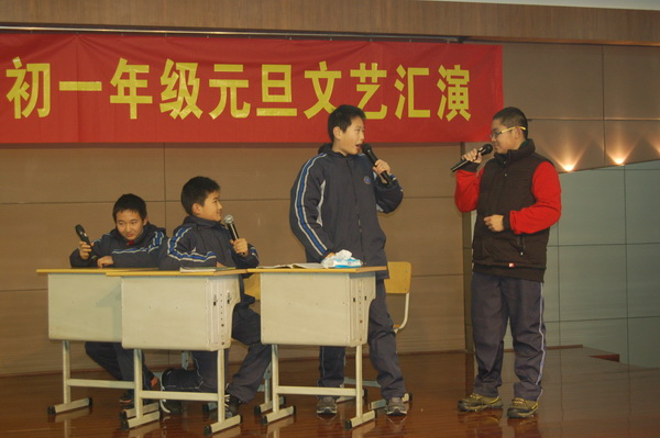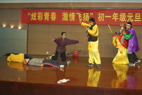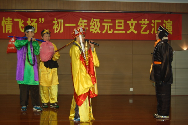 初一年级的同学们精心准备的节目内容丰富,形式多样,有舞蹈、歌唱、话剧、器乐表演、小品等等。初一4班的歌舞串烧《舞动奇迹》拉开了初一元旦文艺汇演的序幕,健美操和交谊舞的串烧将不同风格的舞蹈同时呈现在舞台上,博得了观众的阵阵掌声;初一3班的《天网恢恢》、初一6班的《白雪公主》和初一1班的《超级大杂烩》这几个小品以其诙谐幽默的语言和动人逼真的表演引来阵阵笑声和欢呼声;歌舞表演更是给观众带来了一场视觉和听觉的盛宴,初一5班的《冰凌花》、初一2班的《雨中曲》、初一7班的《我们的青春梦想秀》、初一8班的《查尔达斯》和初一9班的《让青春歌舞到底》将多种表演融合在一起,达到了美妙的效果,可谓精彩纷呈。压轴好戏是由初一10班带来的英语话剧表演《三打白骨精》,精湛的表演再一次将全场的气氛推向了高潮,一时间,会场内笑声、掌声、欢呼声交融在一起。继年级文艺汇演之后,各班又开展了班级迎新活动,