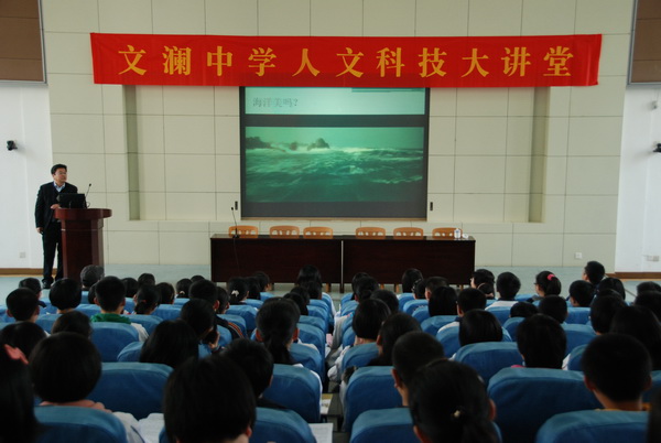 发现海洋之美。由美育协会主席温泉主讲的《发现海洋之美》,处处洋溢着海洋的美感。报告重点围绕中国青少年美育协会-美感的育成,科学与艺术的结合-新的观察维度,发展自然科学-海洋学的崛起,发现海洋之美-科技与艺术的力量四方面做了详细的讲解。在报告中,温泉主席结合一个美国画家的故事告诉同学们“真正体验亲近自然,改变理念,从美学出发,热爱海洋事业,为建设海洋强国而努力。”报告在同学们热烈的掌声中结束。