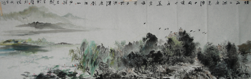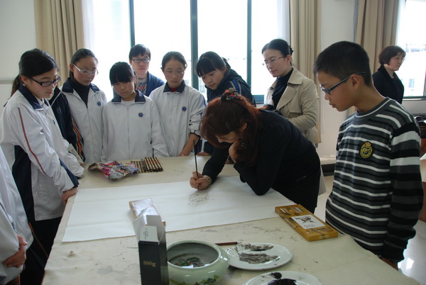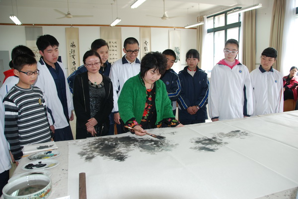 这次活动不仅让我校学生享受了一顿丰盛的人文科技大餐,还让我校学生受到了艺术熏陶。在我校国画室, 中国青少年美育研究工作委员会主任路民等10位画家,共同创作了巨幅写意山水画《烟雨西湖》,并对书画社的同学们进行了悉心指导,同学们也很珍惜大师们的指导,一直在一旁仔细观摩并聆听教诲,倍感获益匪浅。
