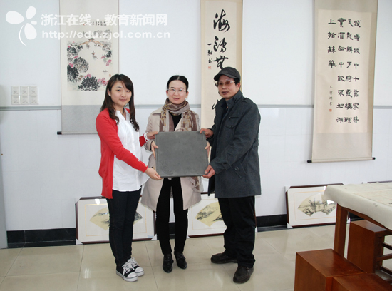 最后,浙江在线记者将一方沉甸甸的练字青砖赠送我校书画社留为纪念,寓意着将环保的理念贯穿于书法艺术之中。