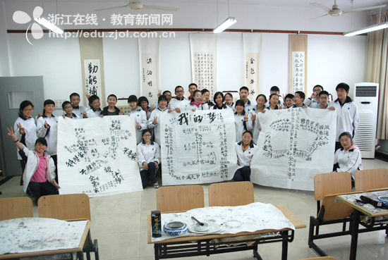 4月10日下午,浙江在线联合杭城中小学特别策划的“书写我的中国梦”活动,走进我校,完成了梦想的最后“聚集”。文澜书画社31位学员舞文弄墨,在“梦”字上填满了自己的青春梦想。这是继采荷二小的“中”字与采荷一小的“国”字之后,“中国梦”的最后一站,也是“中国梦”的大合体。