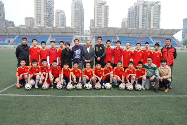 谢晖、黄翌两位教练与我校领导、老师及校男子足球队合影