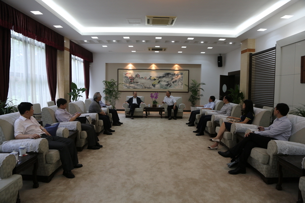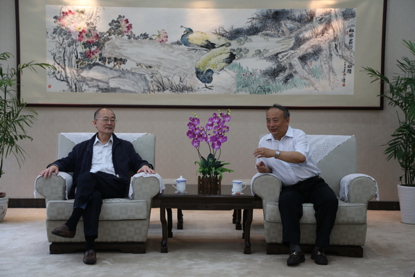 任继长校长向赵阳副主任(左)介绍学校基本情况以及开展华文教育的情况