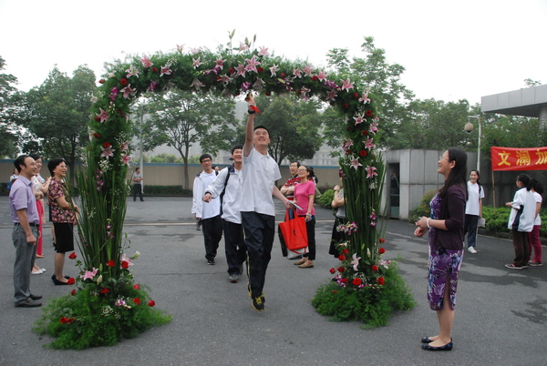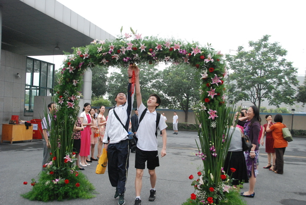 一大早,学校的大门口就已装扮一新,绿荫鲜花装饰的彩门悄然出现在喷泉的前方,门的正中悬挂着的一个铃铛格外吸引眼球。据悉,这是我校老师们为考生们精心准备的“凯旋门”,寓意越过此门走向考场,摇响铃铛,必将高中,凯旋而归。不仅如此,老师们今天的着装也颇为亮丽,几乎都是红色系列,几位班主任还笑谈是翻了好久衣柜特意挑选出来的,红色是中国的吉祥色,就为了给孩子们增加信心,用自信的心态面对考试。随着时间的推进,校门口渐渐热闹了起来,原来是每个班的保送生、特长生来给自己的同学们助威来了,有的保送生拉起了“加油”横幅,有的保送生则将买来的幸运绳送给自己的同学们。只见一位位考生接过同学们的祝福,和老师们一一拥抱,迈过凯旋门摇响铃铛,充满信心地微笑着迈向考场,相信这是一个美好的开始,我们的每个考生必将带着老师和同学的祝福,向着梦想扬帆起航!