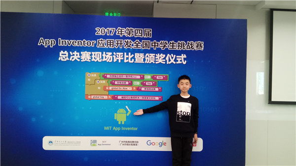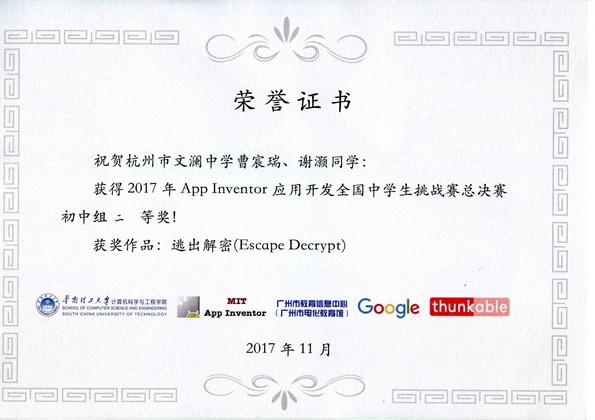 此次比赛由Google和华南理工大学计算机科学与工程学院共同组织,是针对全国青少年的第四届App Inventor竞赛。这次决赛的评委和嘉宾阵容也豪华无比,有来自全国知名高校的计算机领域教授、MIT大神、Google工程师和设计师,选手们的专业知识将会被这些科技精英进行严格的考核和检验。本次大赛,全国范围内200多所中小学一共有1300多件作品提交,我校曹宸瑞和谢灏两位同学组成的战队,他们的作品《逃出解密》(青少年益智APP)顺利晋级初中组全国前11名。由曹宸瑞同学作为战队的代表,经过10分钟的自由展示+5分钟评委答辩环节,荣获全国二等奖,该作品同时获得2017年杭州市中小学生科技节信息学竞赛 Android手机应用程序开发竞赛一等奖,恭喜他们!